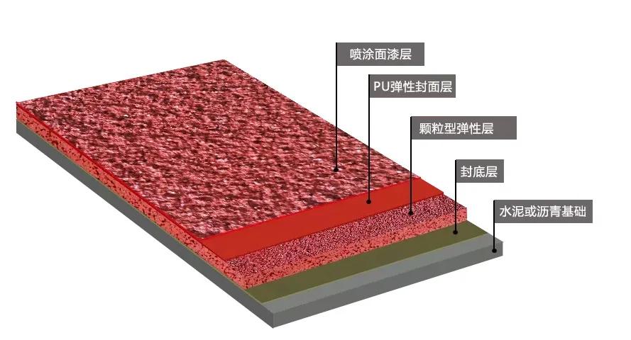 复合型塑胶跑道是由橡胶颗粒为底层,PU封底层,聚氨酯颗粒与塑胶浆为面层铺设而成的高性能塑胶结构,具有弹性好、色泽鲜艳、强度高、弹性好、耐磨、防滑、耐低温、防震隔音、经久耐用等特点。其外观与混合型塑胶跑道一致,除拉伸强度外其它数据与混合型塑胶跑道基本一致。