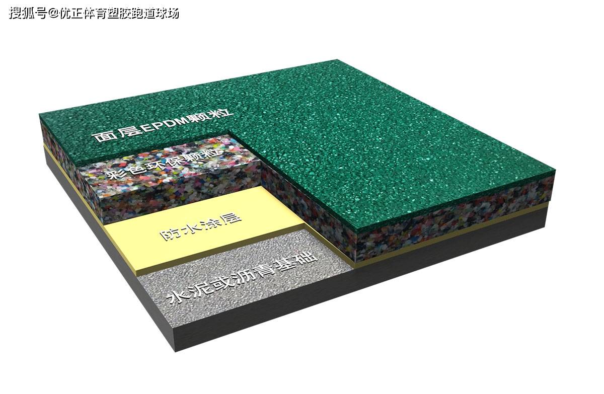 分两层结构,底层以再生胶粒与单组份胶水按比例混合搅拌后经由专业施工队铺设压平,面层由EPDM橡胶颗粒与单组份胶水混合而成,厚度为13mm。