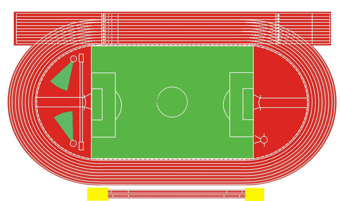 1.标准跑道全长为400米,应由两个平行的直道和两个半径相等的弯道组成。除草地跑道外,跑道内侧应用适宜材料制成的突沿加以分界。突沿高约5厘米,宽至少5厘米。