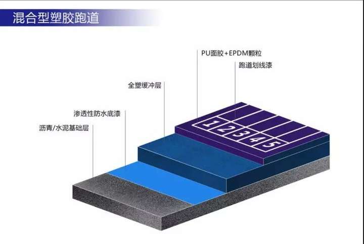 混合型塑胶跑道材料是由全PU掺杂部分橡胶颗粒为底层,聚氨酯颗粒与塑胶浆为面层铺设组成的高性能塑胶结构。它是国际田联认可的运动场地。