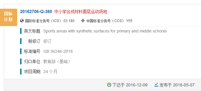 历经2年多时间,走南闯北做调研,新修订的塑胶跑道国家强制性标准——《中小学合成材料面层运动场地》GB 36246-2018 在国家标准化管理委员会网站,昨天正式批准发布,终显示发布日期为5月7日,如果小编消息没错,应该是下午时分更新在网站。