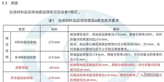 注:旧国标厚度方面球场没有过多阐述和具体要求,新国标明显要求大于等于8mm,对于 平时习惯做3-5mm球场来说,简直发生了翻天覆地变化 !塑胶跑道方面由于大家平时习惯少做10mm厚度,旧国标也是可以接受的,新国标明显配合规范行业市场要求,坚决严格要求塑胶跑道的厚度≥13mm。