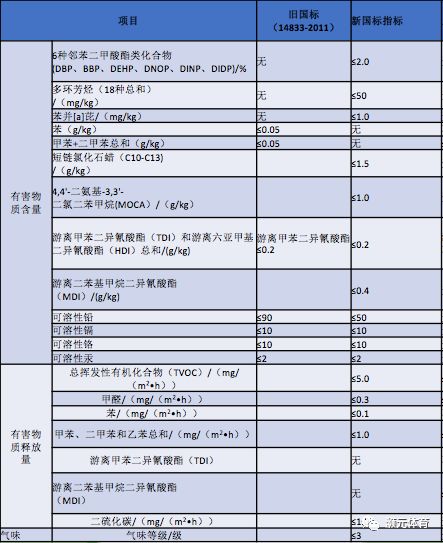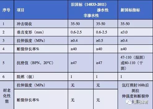 新国标相对于GB/T19851.11-2005增加了增加了合成材料运动场地面层、现浇型面层、预制型面层、人造草、冲击吸收、垂直变形、抗滑值、拉伸强度、拉断伸长率、耐老化性能、阻燃性能、坡度、厚度等项目和指标要求。这里只做了新国标和GB/T14833-2011的对比: