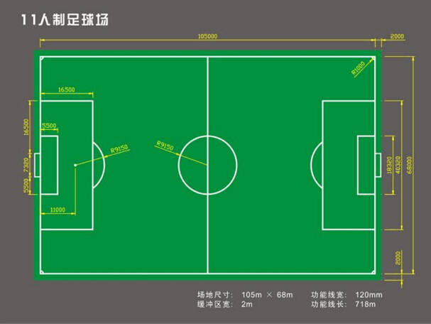 11人足球场地的标准尺寸是长90到120米,宽45到90米,而国际之间的一些比赛要求的一些尺寸是100米到110米,宽64到75米,世界杯决赛阶段要求的比赛尺寸是105乘68米,中圈是以中心点为圆心,半径是9.15米的圆,罚球弧距离点球点是9.15米。105米×68米,共计占地面积7140平方米。